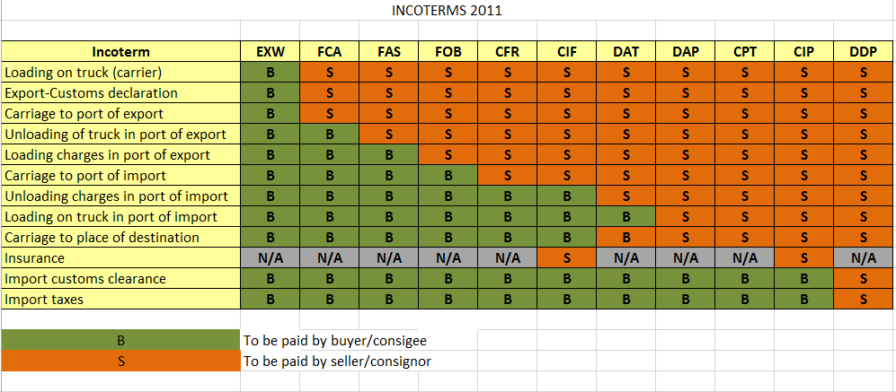 According to the recent amendment in Inco terms 2010, the 13 Inco terms have been modified to 11 classifying them into 2 groups i.e. for all modes of transport and for Inland or Sea transport. Also eliminating 4 terms i.e. DAF (Delivered at Frontier), DES (Delivered Ex-Ship), DEQ (Delivered Ex-Quay) and DDU (Delivered Duty Unpaid). The seven rules defined by Inco terms 2010 for any mode(s) of transportation are: